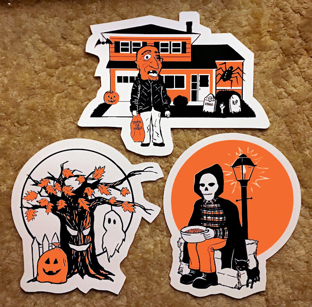 I love the annual invasion of monsters in nearly every retail outlet. I go out of my way to explore shops all over my region. Hardware stores become well-lit spook houses, and routine grocery shopping suddenly involves a walk through a gallery of horrors. I don’t typically load up on new Halloween items, save for cheap dollar store offerings. I prefer old stuff. But Target got me this year with their new line of 80s-infused decor. They tapped into punk, Richard Simmons, shutter shades, clear telephones and a color palette straight from the carpet of a video arcade. But my favorite is a mayoral looking jack-o-lantern-headed blowmold. He’s one of several recurring characters like a green-skulled skeleton, and the mohawk skull. I appreciate the idea of Halloween mascots, even if they’re corporate. I mean, Rudolf the red-nosed reindeer was created for Montgomery Ward stores, so why not?