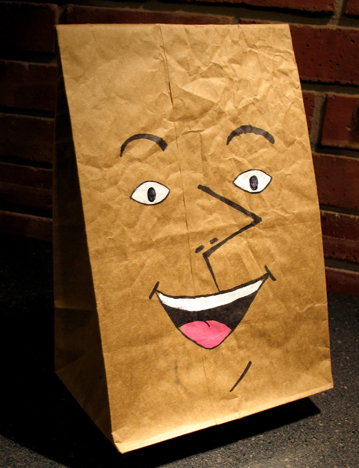 Then, as the lights went up and the half-hearted clapping died, I announced that I had a special guest— paper sack himself! I revealed a brown bag that I had painted to match the star of the film (see photo below), and the crowed seemed to warm up, sensing a punchline to the whole bit. I thanked the bag for coming and asked him a simple question. All eyes looked to the sack, but he wasn't talking. I tried to convince him to speak, but he remained quiet. Unbeknownst to the group, this was my intention. After a few more fruitless pleas followed by uncomfortable silence, I apologized for the confusion, and concluded my presentation.
