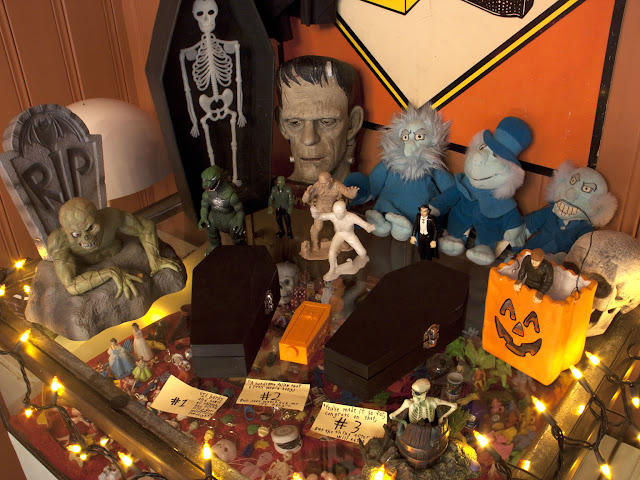 My son turns eleven soon, that precarious age when some of the greatest thrills of childhood become endangered. (I say a 'thank you' prayer every time he holds my hand in public.) Most of his friends are already proclaiming that they've aged out of going door to door for candy. I hope my son will stick with it a few more years. (I did, despite being ridiculed, though it was nothing new to a guy who never packed up his childhood toys.) However, I'm planning a transitional year of both candy getting and candy giving. I'm looking forward to it: open windows blaring spooky sound effects that were recorded in the 80s, something black and white playing on TV, standing among my fully functional decorations and my mini-graveyard, and making a memory so great that hopefully my son will write about it on the internet in thirty years.