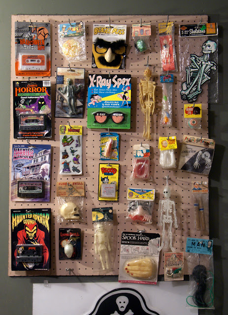 Lastly, I expanded my collection of Halloween audio tapes. I will likely give these a separate post at some point. There's one called Haunted Mansion Cassette Tape that's given me little jolts of joy ever since I hung it up months ago. The natural (hedonistic, materialistic, greedy) thing to do was seek out more of this pleasure with more tapes. My set of four inspired me to update my pegboard display with a spooky theme.