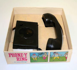 The Phone-Y Ring was produced by Cal Themes who was also responsible for a line of "jiggler" creatures and animals, as well as a selection of suggestive box gags. It came out in 1980 which happens to be the same year that CaddyShack hit theaters. Thus, Rodney Dangerfield's high tech golf bag, complete with telephone, may be the inspiration behind the golfing imagery on the side of the box.