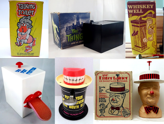 Of course the big question is, what exactly were they selling? After a lot of staring and a lot of googling I've been able to identify over two dozen objects, and I've located photos of most of them. Some I recognize, but couldn't find photos of. These include: the big blue Sob Scarf, the Talking Refrigerator at the bottom, and that particular Lucky Dice display.