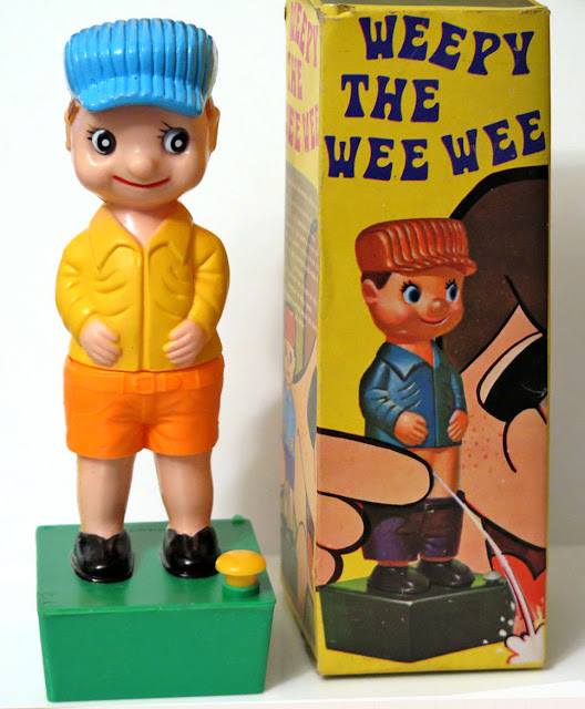 Urinating statues have been around since ancient times, but during the last century they finally became portable (and affordable) thanks to the advent of squirt gun mechanics. I'm impressed with the way this figure is designed with careful ambiguity, so as to cater to both young and old, and notice how the genitalia is obscured on the package while still communicating the product's function. But despite so many well-made decisions, I think the name was a big mistake. I was writing a paragraph that explained the problem, and explored possible solutions when I realized that I've already lingered on this way too long.