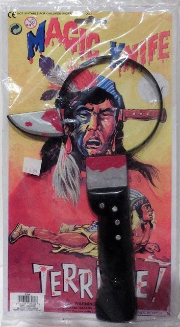 Kicking off a series of "thru head" items is the Magic Knife. The name of the product, the unrestrained graphics, and the chintzy plastic construction blur the lines between illusion, costume accessory, and toy. The blood splattered word "TERRiBLE" is simultaneously appropriate and out of place. The whole thing smacks of cultural illiteracy, which only adds value in my opinion. The Native American artwork may seem odd, but I'm betting that it's an attempt to associate with the better-known Arrow Through Head tradition. One thing is for sure, Knife Thru Head poses a real marketing challenge. Just look at these other designs...