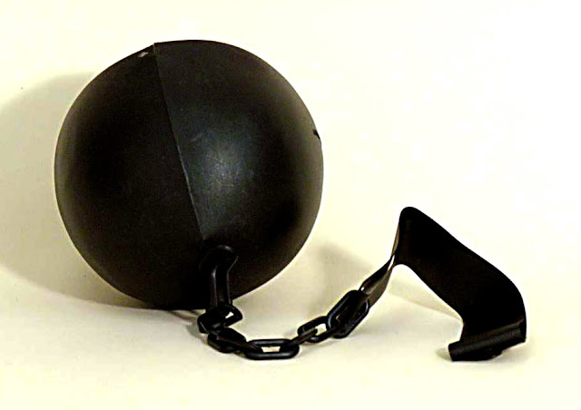 Even at this place a ball and chain seems like an odd choice for a window piece. There I go again, always underestimating the number of people interested in dressing as the standard black-and-white-striped prisoner. In actuality, it's been a staple for decades. It's half of the old 'cop and crook' couples' theme, plus, a prisoner represents deviance in the most general sense. In fact, the ball and chain is an internationally recognized symbol for captivity even though it hasn't been commonly used for generations! Now I totally get why they put one in the window.
