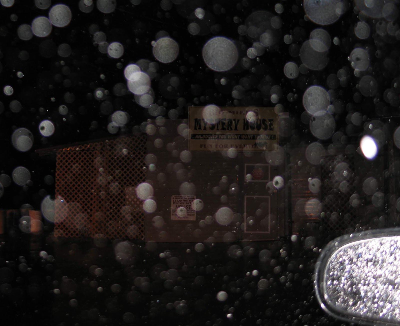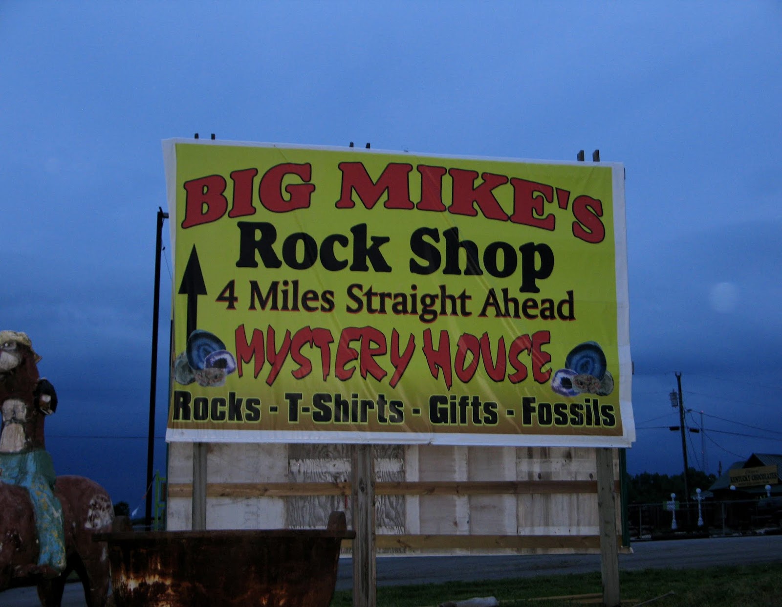 The horizon was flickering with wild lightning when we saw a sign for a rock shop and mystery house four miles away.