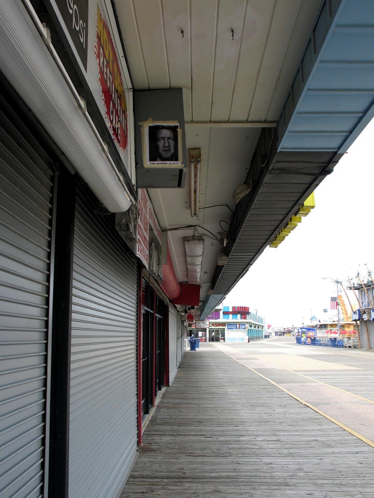Places that were open included: a couple t-shirt shops doing prep work for the following week, a toy shop, an arcade full of crane games, and two pizza joints. As Chris and I tried to determine the best pizzeria, workers from each place walked out of their empty buildings to woo us. We were each handed menus, and told about VIP discounts, free refills and other amenities. The decision was paralyzing. I don't remember what finally coaxed us inside one of them, but I feel bad that we dealt such a blow to the other place.