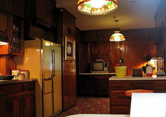 I'm so ready for all-over wood surfaces to make a comeback. I don't care if it's the real thing or flimsy paneling. The idea that rooms need to be "opened up" with light colors is a plague on our society. (I wouldn't mind the return of avocado appliances either.) Elvis's kitchen put me at ease. Nothing else could make him seem so human.
